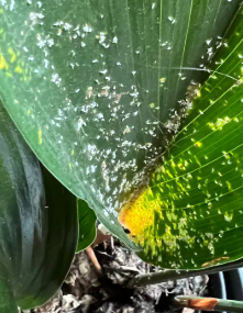 yellowing or browning leaves, wilting, soft or decaying roots, brown or black leaf spots, tip scorch, reduced vigor, sticky honeydew, cottony white masses and fine webbing