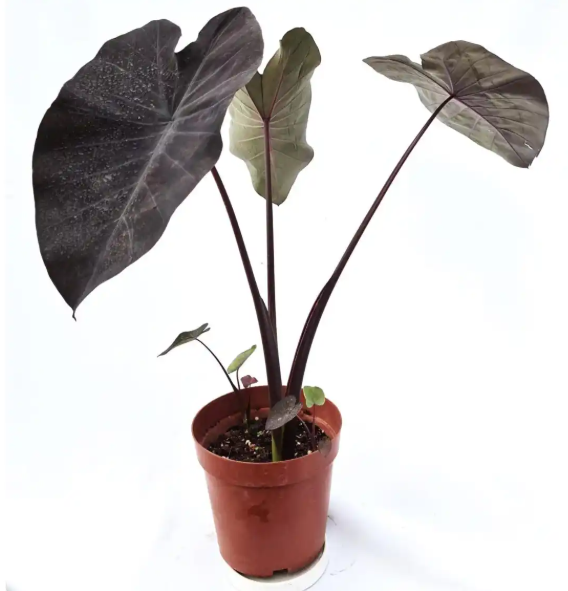 A striking ornamental taro grown for its dramatic, dark purple-black heart-shaped leaves, whose corm is edible like other taros, providing a starch source.