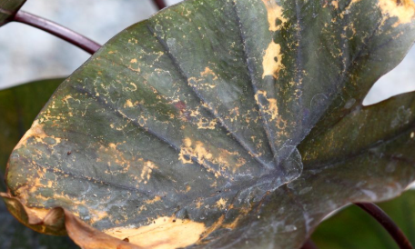 yellowing or drooping leaves, soft or foul-smelling corms, water-soaked or brown leaf lesions, leaf edge burn, leaf collapse, sticky honeydew, fine webbing and speckling