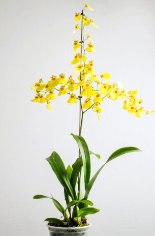 yellowing or pleated leaves, shriveled or blackened pseudobulbs, soft or rotting roots, brown or black leaf spots, water-soaked lesions with foul smell, bud drop, leaf distortion, sticky honeydew and fine webbing