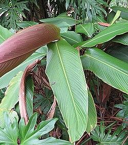A lesser-known tropical plant in the Marantaceae family, grown for its attractive, patterned foliage with a frosted (pruinose) underside, used as a shade garden ornamental.