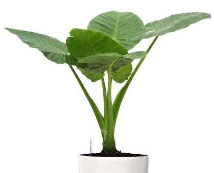 An ornamental taro prized for its striking dark leaves with contrasting white veins, grown for dramatic foliage and an edible starchy corm.