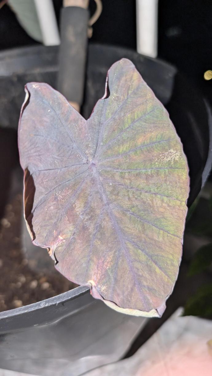 A striking ornamental taro grown for its dramatic, dark purple-black heart-shaped leaves, whose corm is edible like other taros, providing a starch source.